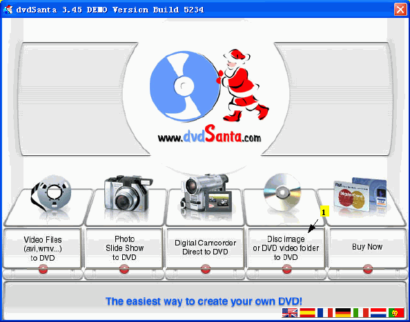 Step2. This is the first screen of dvdSanta. What you need to do now is select the Disc Image icon that the arrow shows(1).