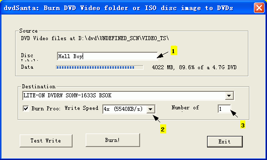 Step3. A new window comes up. First, you need to select the label you want your disc to have (1). Then select the write speed(2) and the number of copies you want to make (3). Make sure everthing is ready, click the Burn button to start burning.