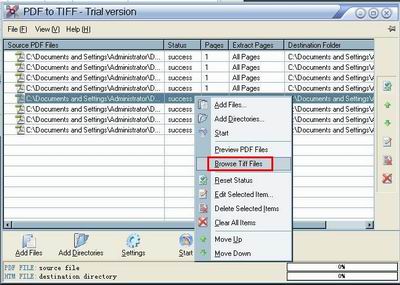 Step6. Usually,the pdf files have been converted,you want to view the outputting result tiff files.Here you can move the mouse upon the pdf file and right press mouse,it appears pop-up menu, then select button "Browse Tiff Files" to open result tiff file automatically.