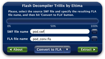 Flash Decompiler Trillix for Mac is a powerful SWF to FLA converter which converts Adobe Flash SWF files back into FLA format which can easily be edited in native Flash environment. Every group of objects such as morphs, shapes, texts, fonts, motions, sounds, ActionScripts, etc. could be placed in separate FLA library groups, which makes using and working with the resulting FLA file much easier.