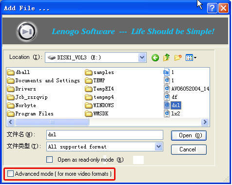 Step3. Click "Add File" button and you'll see a dialog below. If you want to see the full list of all supported video formats, the check the "Advanced Mode (for more video formats)" checkbox. Select the video file you want to convert, and click "Open" button.