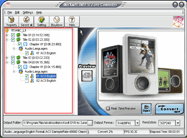 Step2. Insert any DVD disc into your DVD-ROM and launch dvdxsoft DVD to Zune Converter. Click "Open" button button to load DVD and show chapters in list box. The concise interface is as follows: