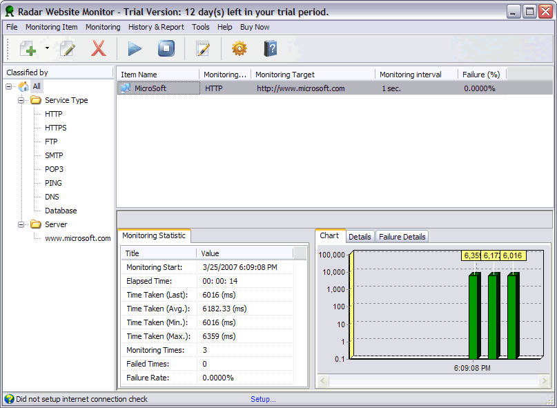Radar Website Monitor is a multithreaded website monitoring software that keeps a close and constant watch over your website. It can monitor different types of internet services, including HTTP, HTTPS, SMTP, POP3, FTP, DNS, Ping, Database and TCP. When your website is detected inaccessible, loads improperly or responds excessively slow, Radar Website Monitor will send an immediate notification to you. It can even run previously specified applications automatically! You define the interval of time that Radar Website Monitor provides you with real-time reports and charts, allowing you to easily understand and evaluate your website's performance.