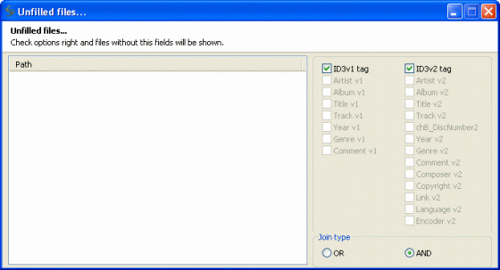 Box with tag options In this box you can select options for files. Files without these properties will be show in the list on the left side. Join type Here you can select how the multiple selections will be joined. If you select AND option, all checked options needs to be fulfilled. On the other hand the OR option will select files with at least one (one or more) option fulfilled.