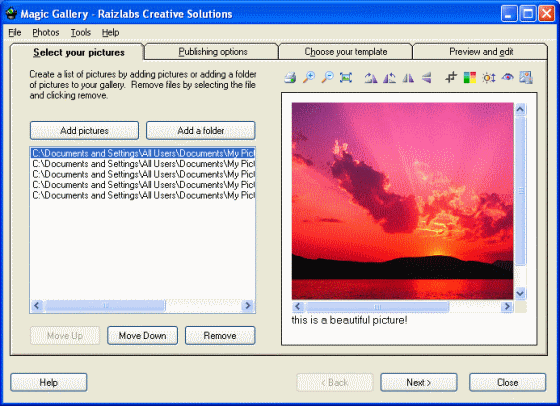 This software allows you to select where your thumbnail gallery will be published. You can select a location on your computer as well as selecting a location on your web server.