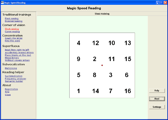 Shultz tables develop peripheral vision. Gently anchor your focus on the center of the screen. User Guide and FAQ - More Details |