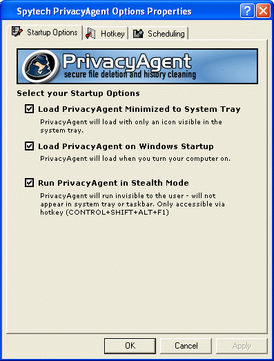 Privacy Agent's general settings including Startup options, Hotkey and Scheduling setting.