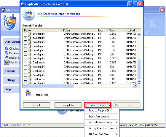 After successfully scanning the selected drives and/or folders for obsolete files, Giant Disk Cleaner will display a list of all obsolete files found. You may then select the files you would like Giant Disk Cleaner to remove.