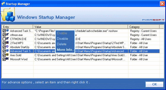 In this window you can manage your startup programs. User Guide and FAQ - More Details |