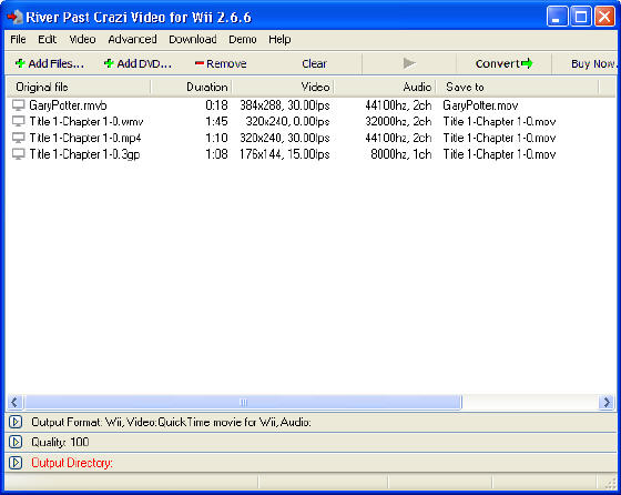 River Past Crazi Video for Wii - User Guide and FAQsScreenshots - More DetailsHow to convert RMVB 3GP MP4 WMV to Wii video?Step1 Start River Past Crazi Video for Wii. You will see its main interface.Step2 Add a Video File. Click on the "Add" button. You are given a standard file open dialog.