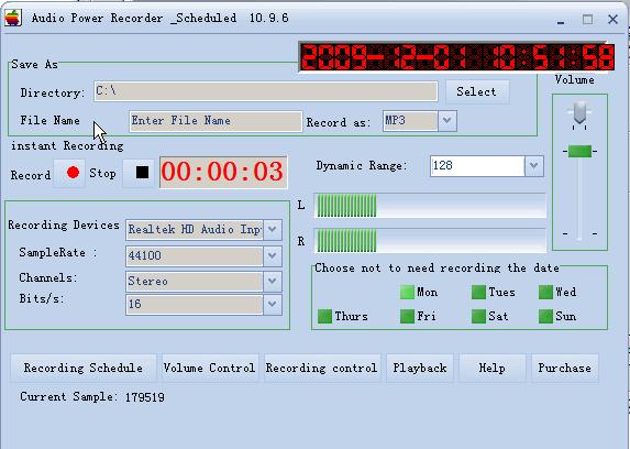 With the software, either recording web radio, film sound and game music or voice chat, all become as easy as turning hand over.Red Apple MP3 Fixed Time Recorder could record sound source from computer interior & exterior.