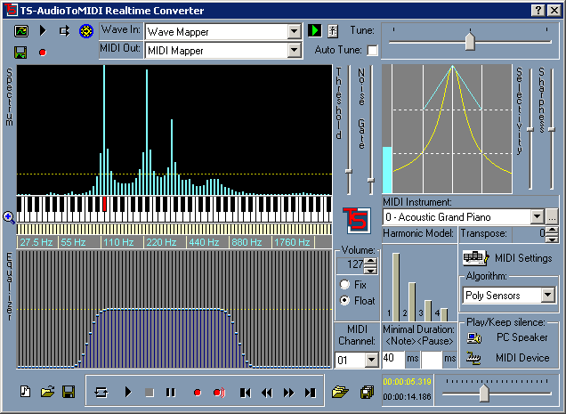 TS-AudioToMIDI provides four different note detection algorithms. A number of filtering options allows to leave aside odd notes. Monophonic methods provide recognition of one (the loudest) voice in melody but with great accuracy. Polyphonic method transcribes several voices.