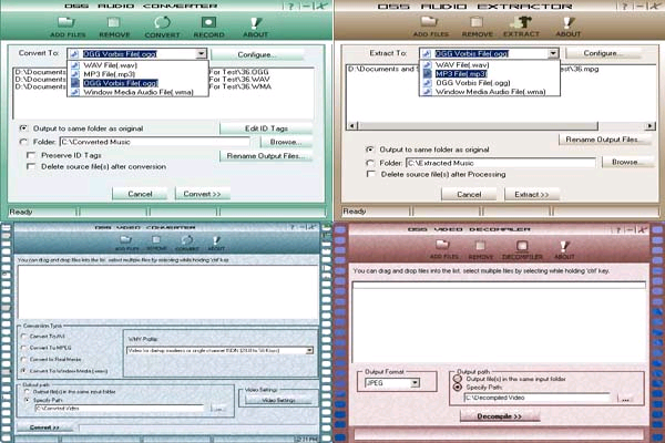 Powerful all-in-one Audio&Video Converter. Two-way audio conversion among (MP3,WAV,WMA,OGG)video conversion from(MPEG-1,MPEG-2,AVI,WMV,ASF) to (MPEG-1,MPEG-2,AVI,WMV,Real Video). Video Decompiling & processing,ID3 Tag Editor and much more.