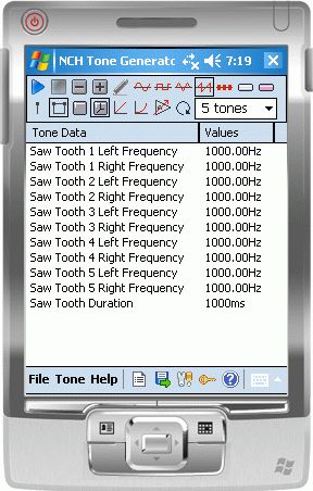 NCH Sound Tone Generator for Windows CE lets you create audio tones, sweeps or noise waveforms using a Windows CE Pocket PC handheld.Quality control and testing of sound cards, Create harmonics by generating multiple sound frequencies.