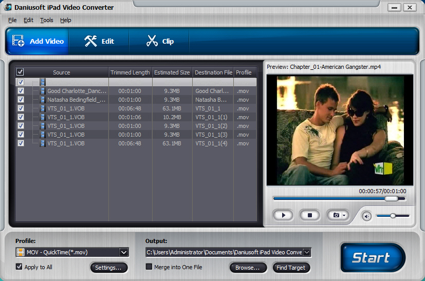 Daniusoft iPad Video Converter is also a smart video editor for iPad. With this iPad Video Converter, you can split large file to segments, extract video clip, merge multiple files into one , crop video black edges, import subtitle, add watermark, flip and rotate video, and set brightness, contrast, saturation, deinterlacing, and other effects before converting Video to iPad.