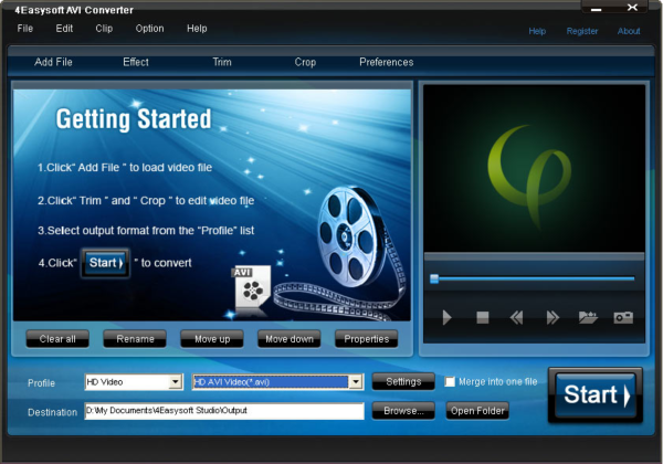 4Easysoft AVI Converter is an easy-to-use video converter which can convert mainstream video files to AVI format. The key formats supported are: MOV, WMV, ASF, 3GP, VOB, MPG/MPEG2, FLV (Flash Video) and HD video files.