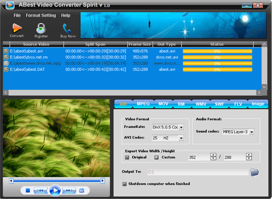 ABest Video Converter Spirit convert video from avi, mov, dat, mpeg, wmv, asf, rm, rmvb, vob, VCD, DVD to avi, mov, mpeg, wmv, rm, iPod, mp4, 3gp, flash swf, YouTube flv, mp3, wma, wav, AC3, gif animation.
