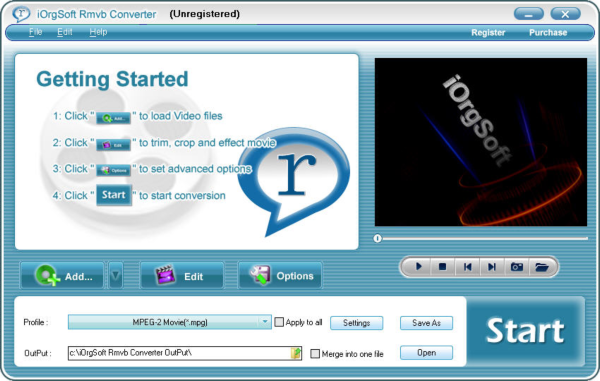 iOrgSoft RMVB Converter can easily convert RMVB files to more widely used video and audio formats: AVI, MPG, MPEG, MP4, WMV, MOV, 3GP, FLV, SWF, MP3, WAV, WMA, M4A, MP2, AAC, AC3, etc. It can also be used as a simple editing application.