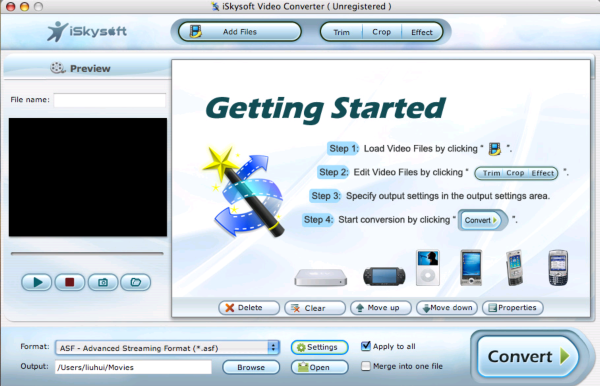 iSkysoft Video Converter for Mac is developed to convert all popular video files from one format to another format and convert video to audio for Mac OS X users.