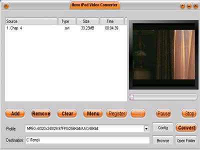 Nevo iPod Video Converter is an all-in-one software which can converter Video format files including AVI, MP4, MPEG, WMV, XviD, H.264, DAT, MOV, ASF , etc. to iPod