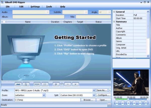 Xilisoft DVD Ripper is an easy DVD ripping tool with fast speed. It can copy DVDs to VCD, SVCD, DivX, MPEG1, MPEG2, WMV, AVI, Xvid, ASF etc. You can select subtitle, movie size, frame rate, audio volume etc. or use default settings when ripping DVDs.
