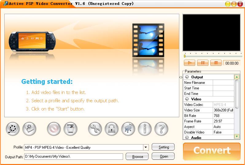Convert video to PSP movie (Sony PlayStation Protable MP4 video format).