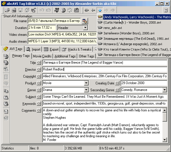 abcAVI Tag Editor is tags managing utility for AVI files + info viewer.
