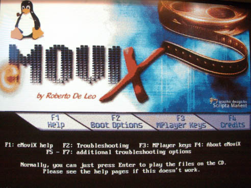 eMoviX is a tiny Linux CD distribution containing all the software to boot from a CD and play automatically every video file localized in the CD root. Supported formats are all formats supported by MPlayer such as DivX, XviD, AVI, MPEG, QuickTime...