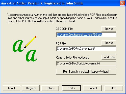 Ancestral Author helps you document your genealogical research by constructing fully hyperlinked Adobe Acrobat PDF files from GEDCOM files, text files, images, and other user inputs.