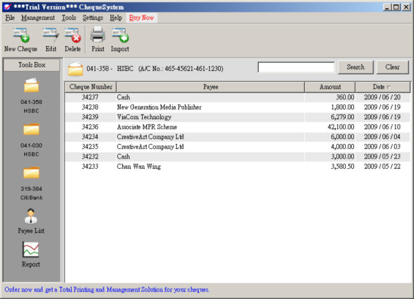 ChequeSystem Electronic Cheque Writer software provides a complete cheque printing solution. Not only allows you print cheques with your printer (Dot-matrix, InkJet and Laser Printer), but also manage issued cheques systematically.