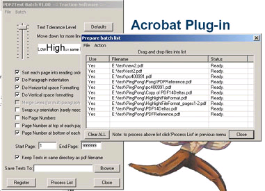 PDF2Text Batch is a plug-in conversion tool for Acrobat Which is used to convert your PDF documents into plain text ascii files. Options are available to batch lists of documents, output page numbers, Paragraph formatting, Horizontal Formatting.