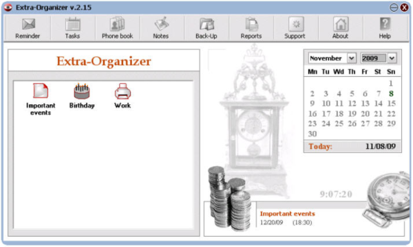 Extra-Organizer is the scheduler, telephone book, calendar, alarm clock and the business manager. Extra-Organizer surpasses many other organizers in functionality, stability and convenience in use.