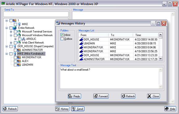 Ariolic NTPager it is useful network messenger for Windows NT and Windows 2000 systems. It allows you to exchange messages with one user or several users of your network, using simple and handy interface.